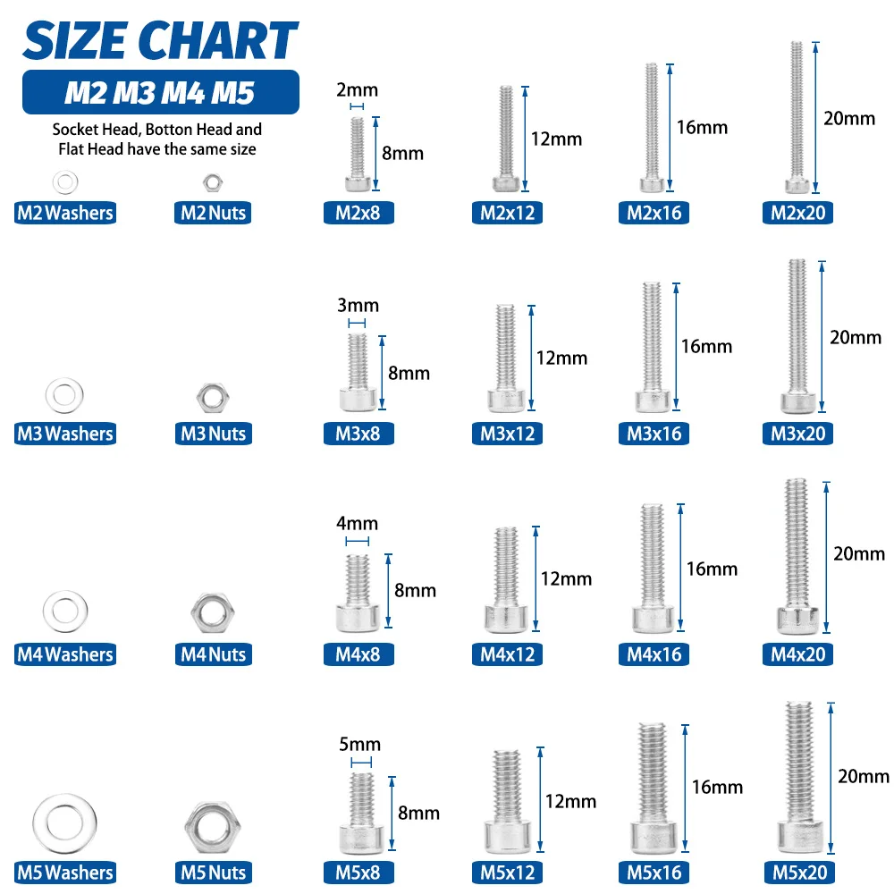 • Our M2 M3 M4 M5 screws and nuts accord with standardized metric system. And the average error is less than 0.03mm. The Nuts and flat washers expand the contact area and reduce the pressure in order to protect the screws and parts.