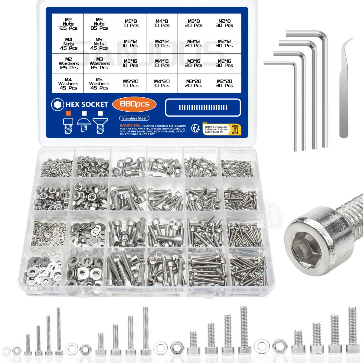 880Pcs Hexagon Hex Socket Head Cap Screw Set M2 M3 M4 M5 304 Stainless Steel Nuts & Washer Assortment Kit